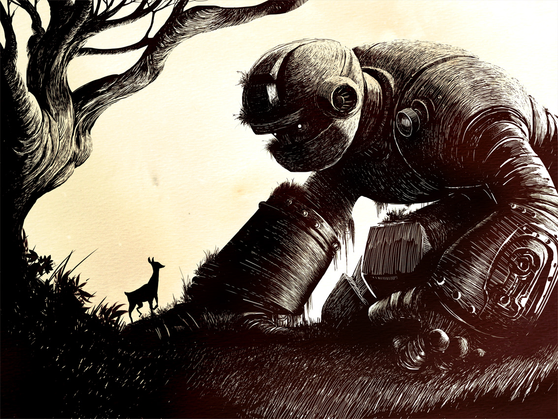 Ilustração digital. Roboto1 é a primeira de uma série de ilustrações que exploram a relação de máquinas com o meio ambiente.